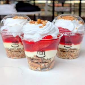 Layers of chocolate mousse, fudge brownie pieces, pistachio filling, and fresh strawberry slices.