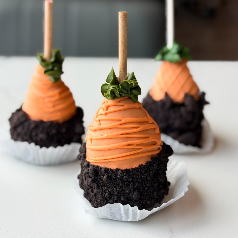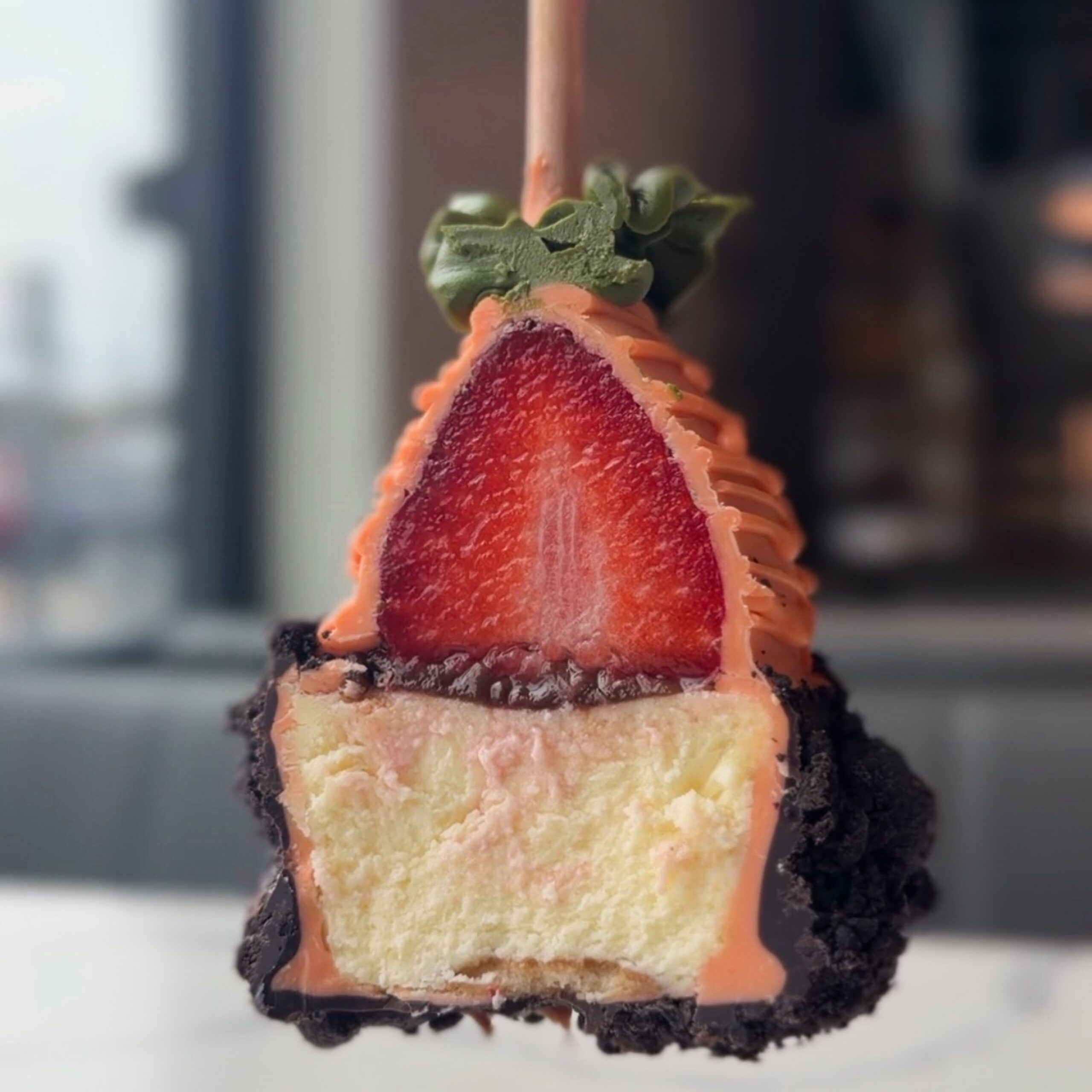 Fresh strawberry, vanilla cheesecake, dipped in orange tinted Belgian white chocolate, then dark chocolate ganache, and rolled in Oreo Crumbs.