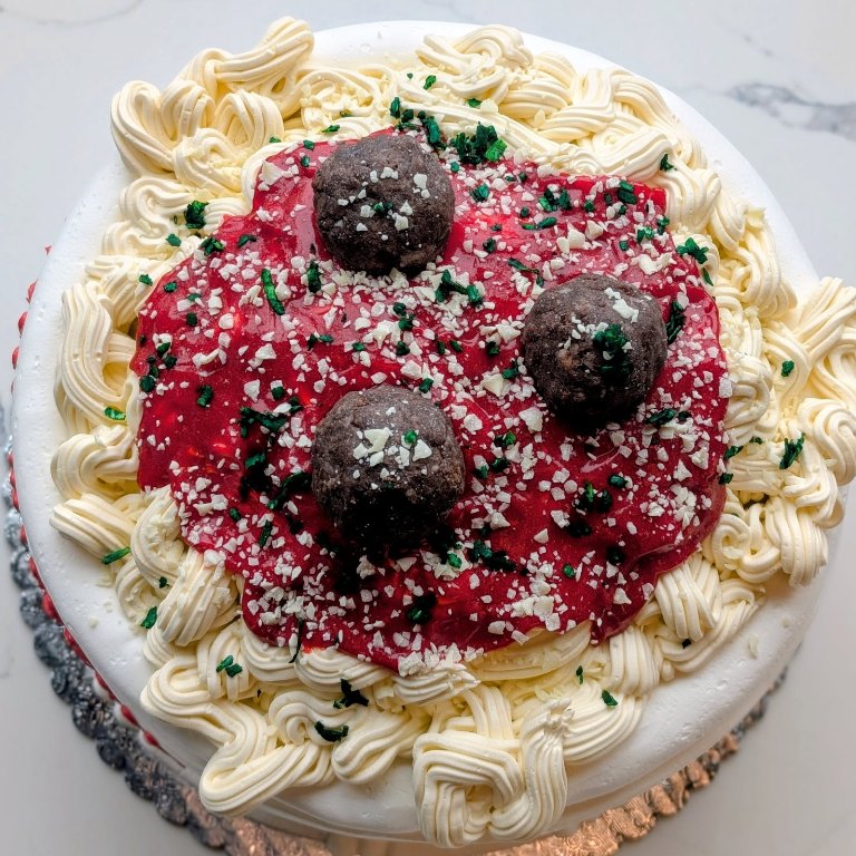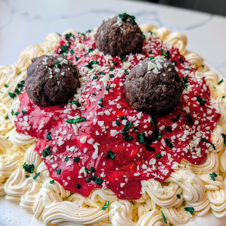 “Meatballs” are chocolate cake donut holes. “Parsley” is green dyed coconut shavings. “Parmesan Cheese” is white chocolate shavings. All other decor is buttercream. The “Plate” is just the top edge of buttercream where the “pasta” sits. The sides of the cake will be the color of the icing that you chose for the cake.